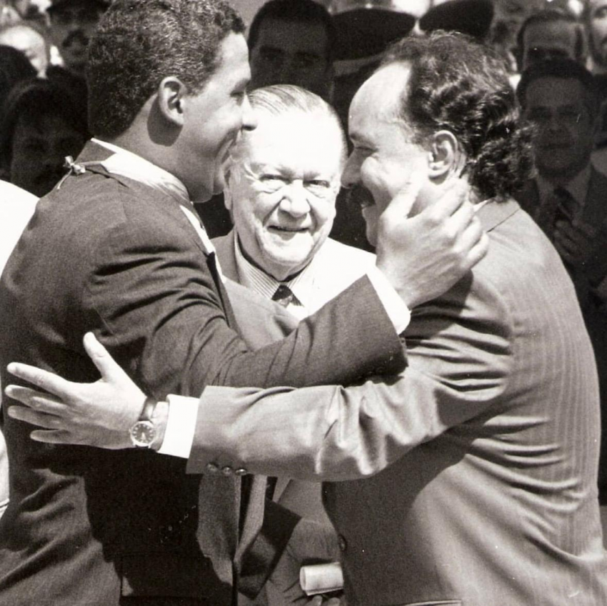 En el momento en que estaba imponiendo a Óscar de León la condecoración del Samán de Aragua donde también nos acompañaba el querido Simón Díaz otro gran Samán de Aragua.